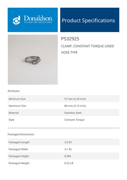 Genuine Donaldson P532925 Clamp, Constant Torque Lined Hose Type is engineered to deliver reliable performance and durability across a wide range of applications. Designed with high-quality materials, it ensures consistent functionality while meeting demanding operational requirements.