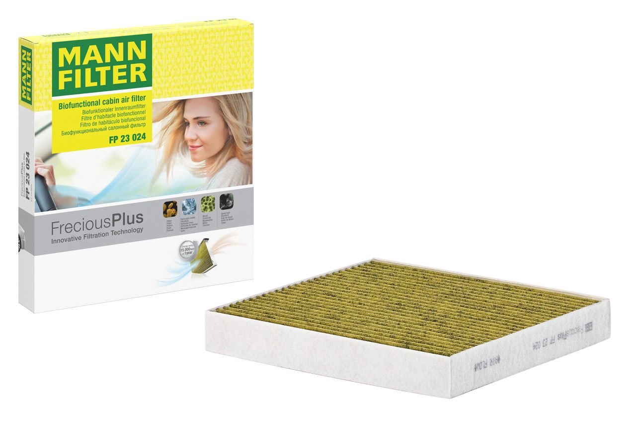 Biofunctional MANN-FILTER FreciousPlus cabin air filters - nearly 100% protection against nitrogen oxides, dust, allergens and mould - harmful gases and unpleasant odours are also eliminated and virus aerosols filtered. The three-layer filter technology absorbs almost 100% of allergens, reduces the growth of molds and bacteria by more than 98% and stops fine dust almost completely.Specification
