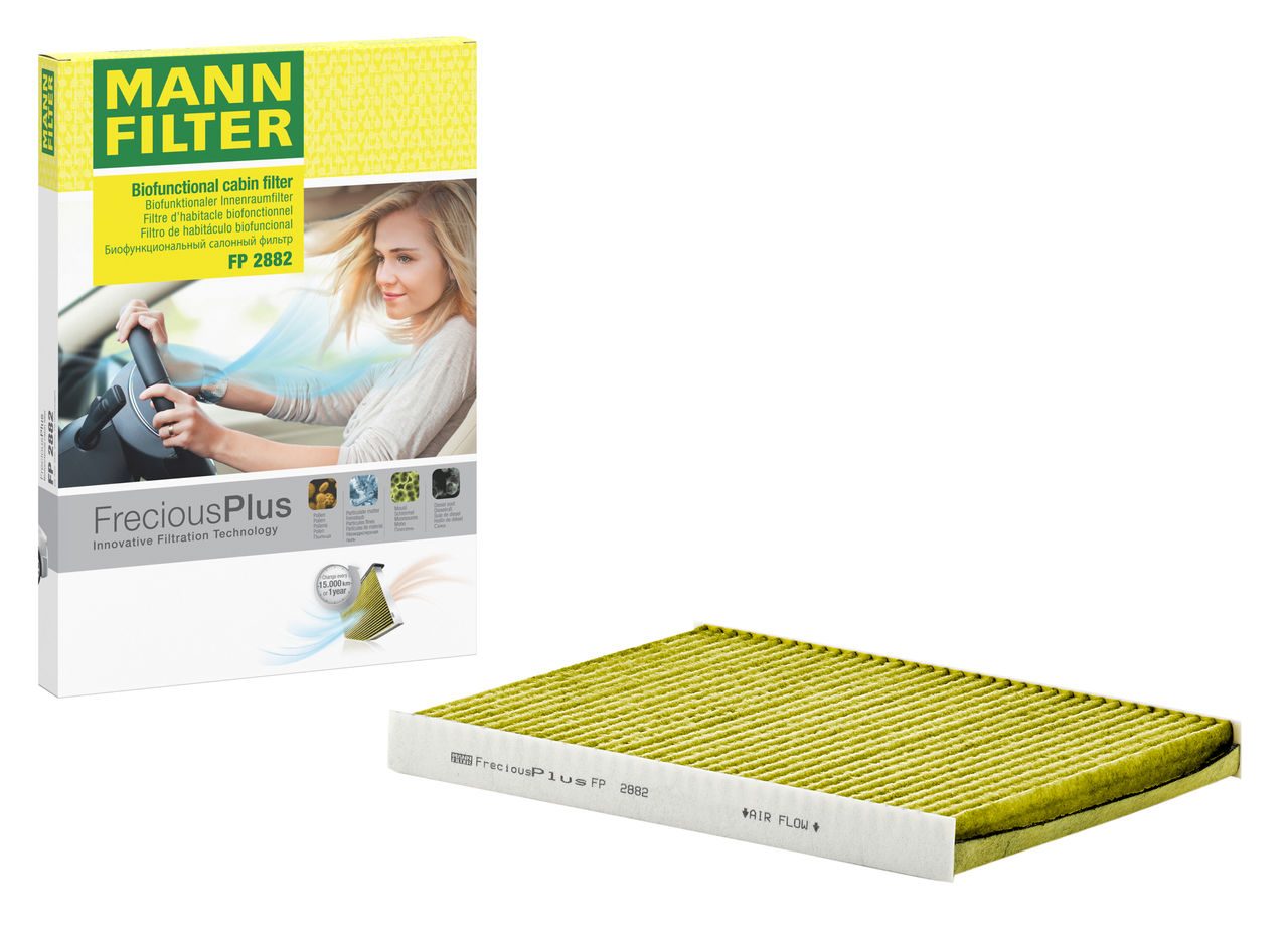 Biofunctional MANN-FILTER FreciousPlus cabin air filters - nearly 100% protection against nitrogen oxides, dust, allergens and mould - harmful gases and unpleasant odours are also eliminated and virus aerosols filtered. The three-layer filter technology absorbs almost 100% of allergens, reduces the growth of molds and bacteria by more than 98% and stops fine dust almost completely.Specification