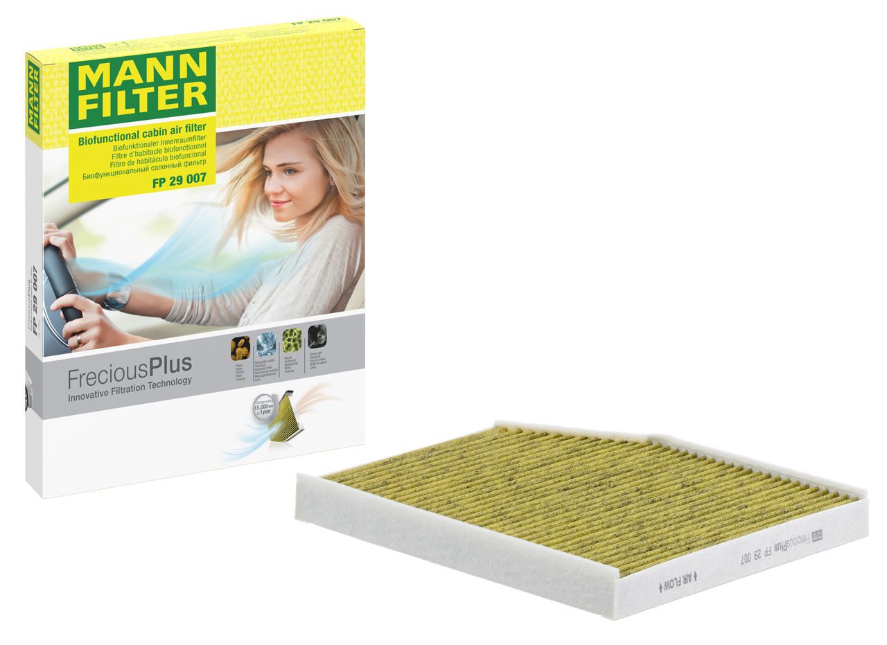 Biofunctional MANN-FILTER FreciousPlus cabin air filters - nearly 100% protection against nitrogen oxides, dust, allergens and mould - harmful gases and unpleasant odours are also eliminated and virus aerosols filtered. The three-layer filter technology absorbs almost 100% of allergens, reduces the growth of molds and bacteria by more than 98% and stops fine dust almost completely.Specification