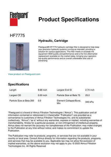 Fleetguard® HF7775 hydraulic cartridge filter is designed to help keep your precision hydraulic systems running as intended, providing a solution for various applications. This filter meets or exceeds the equipment OEM quality and performance and is the first aftermarket replacement available on the market today, bringing your operation top-quality performance and an overall unbeatable total cost of ownership.Specification