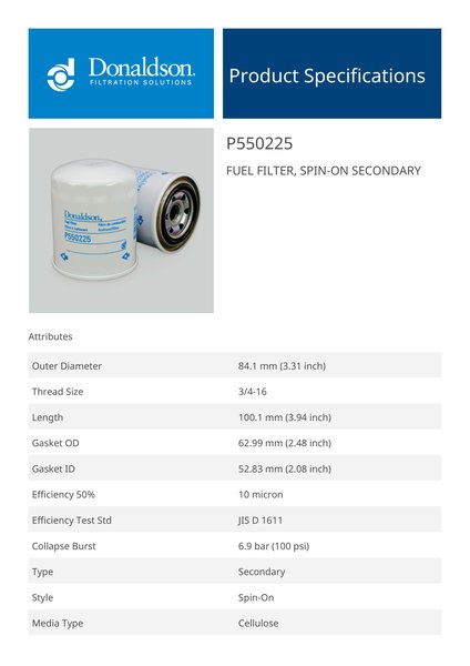 Genuine Donaldson P550225 Fuel Filter, Spin-On Secondary is designed to provide reliable performance in fuel filter, spin-on secondary applications. Built with high-quality materials, it ensures consistent functionality and durability.