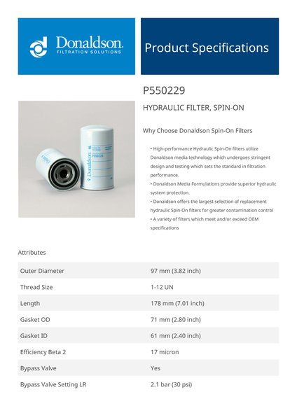 Donaldson P550229 Hydraulic Filter, Spin-On
